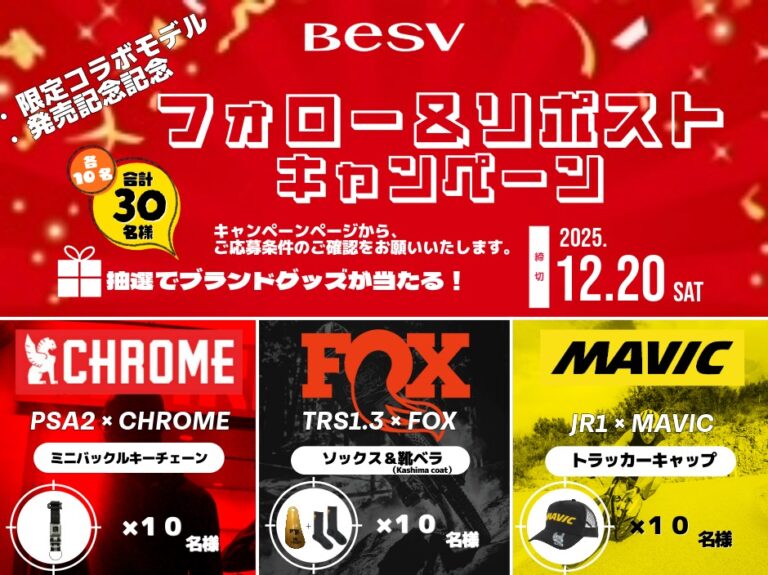🎉 BESV限定コラボモデル記念キャンペーン 🎉 フォロー&リポストでブランドグッズを抽選で30名様にプレゼント! BESV JAPANでは、『PSA2×CHROME(クローム)』、『TRS1.3×FOX(フォックス)』 … 続きを読む BESV限定コラボモデル発売記念キャンペーン - 公式X フォロー&リポストで当たるー